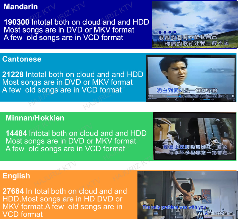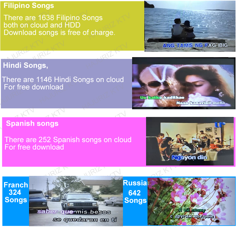 2.Download songs from cloud .There are more than 400K different language songs(Mandarin,Cantonese,Taiwanese,Vietnamese,English,Korean,Japanese,Thai,Burmese,Malay,Filipino,Spanish,etc. More than 10 kinds of songs on cloud ) on Cloud for download.The system updates songs each every week.It will hint Synchronize new updates cloud songs if there are new songs.