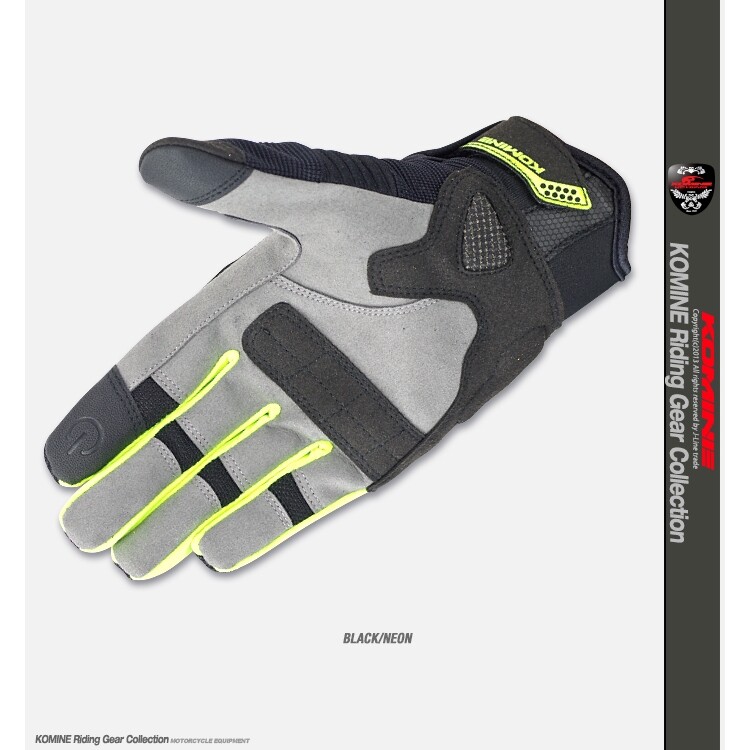 New arrival Komine GK-183 Protect Mesh Gloves BRAVE Touch Screen Gloves Size: M:7.5-8.5cm /L:8.5-9.5cm /XL:9.5-11cm Description Ideal combination of protection and mesh for pleasant summer ride Features ・special synthetic leather sewn for touch panel operation ・COOLMAX® used on finger joints ・foam padding ・foam padding with keprotec® patch ・lnner knuckle protection ・finger guard ・reflective logo for night safety ・airthrough Liteprene panel ・velcro closure Color : BLACK Black /dark grey BLACK/RED BLACK/YELLOW Black/Neon