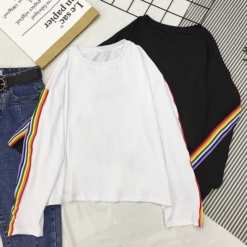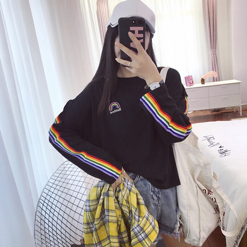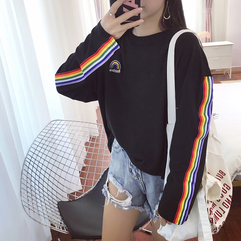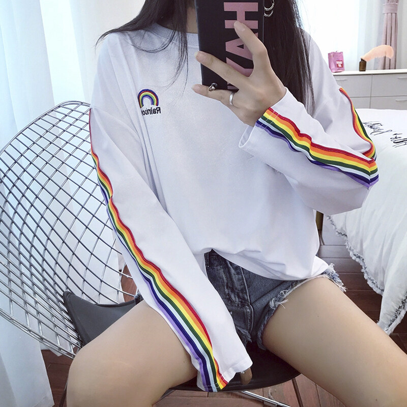 Vanessawang Women Loose Rainbow Shirt Letter Embroidery Long Sleeve Blouse Casual Stripe Top