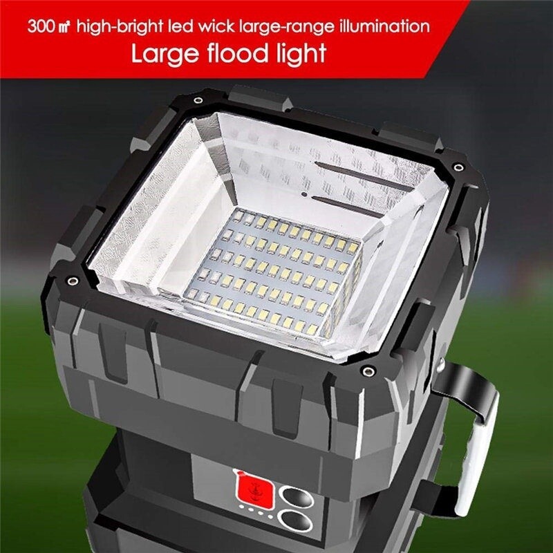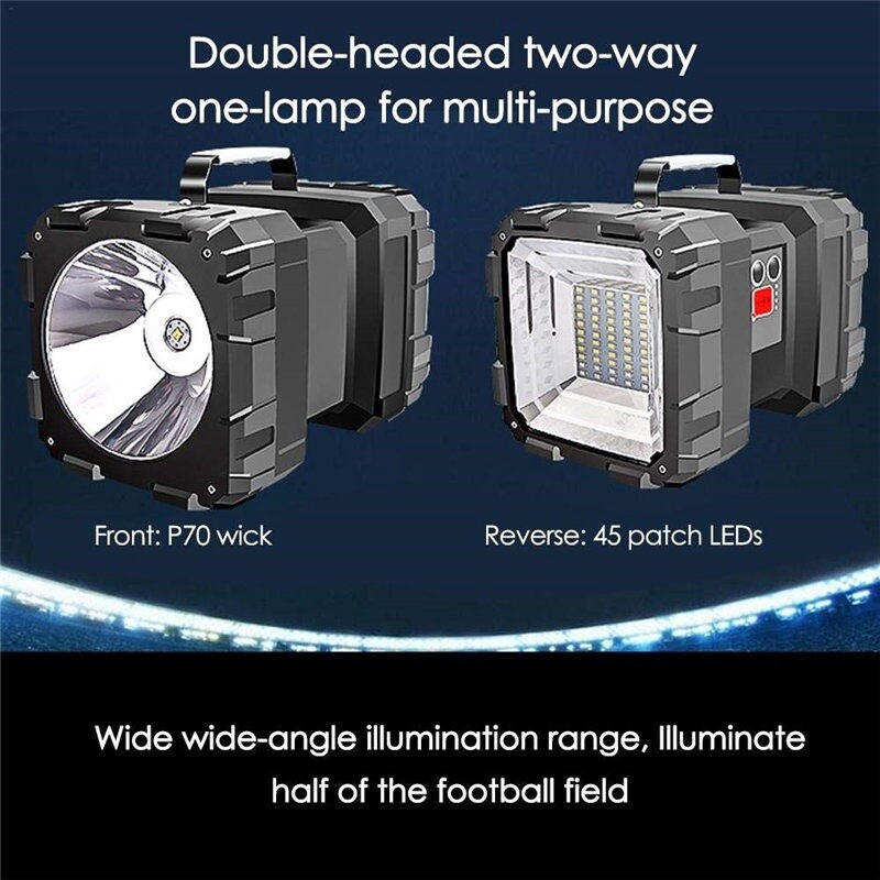 Description Description: - Projector Professional and High Brightness LED Reflectors. - Portable two-way light source for a variety of occasions. - It offers illumination distances of up to 300-500 meters and two different lighting modes, perfect for illuminating the entire room or camp. Built-in large-capacity rechargeable battery for long lighting hours. Waterproof,prevent splashing at various angles,suitable for outdoor environments and bad weather conditions. - Perfect for outdoor activities such as hiking, camping, hunting, cycling and more outside activities. Specification: Light bulb: L2 + 35 patch lamp beads Power: 40w Battery: 2 * 32650 Battery (included) Battery capacity: 10000 mAh Working time: 4-6 hours Charging time: 2-3 hours Lumen: 100000lm Charging voltage: 5v Discharge voltage: 4A Material: ABS Colour: Black Mode: 3modes Function: multi-level switch, tact switch, turn on weak medium light in turn (low white light - white light - strong white light patch (red / blue / flash) P50 strong and weak flash) Battery indicator: The four sides are blue and fully illuminated when fully charged. Charging indicator: When charging, the green light flashes. Fully charged, the green light is always on Charging: USB straight Package: 1 *brightest flashlight 1 * USB charging cable
