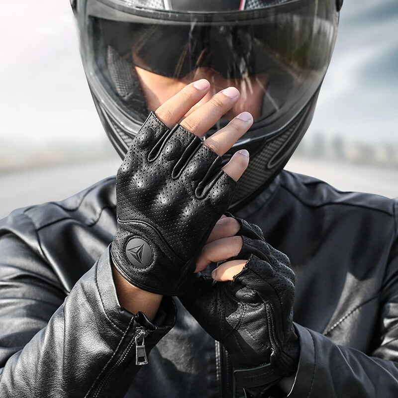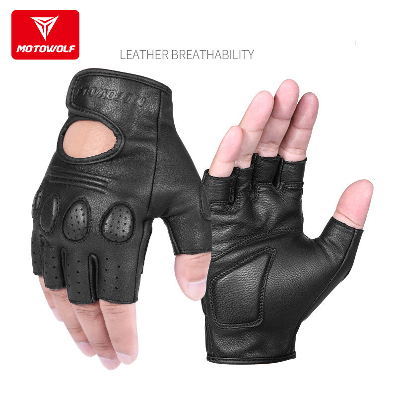 SltcrPasion Half Finger Riding Motorcycle Gloves Sheepskin Leather Moto Cycling Fingerless Gloves Tactical Retro Anti Slip Wrist Adjustable Motowolf