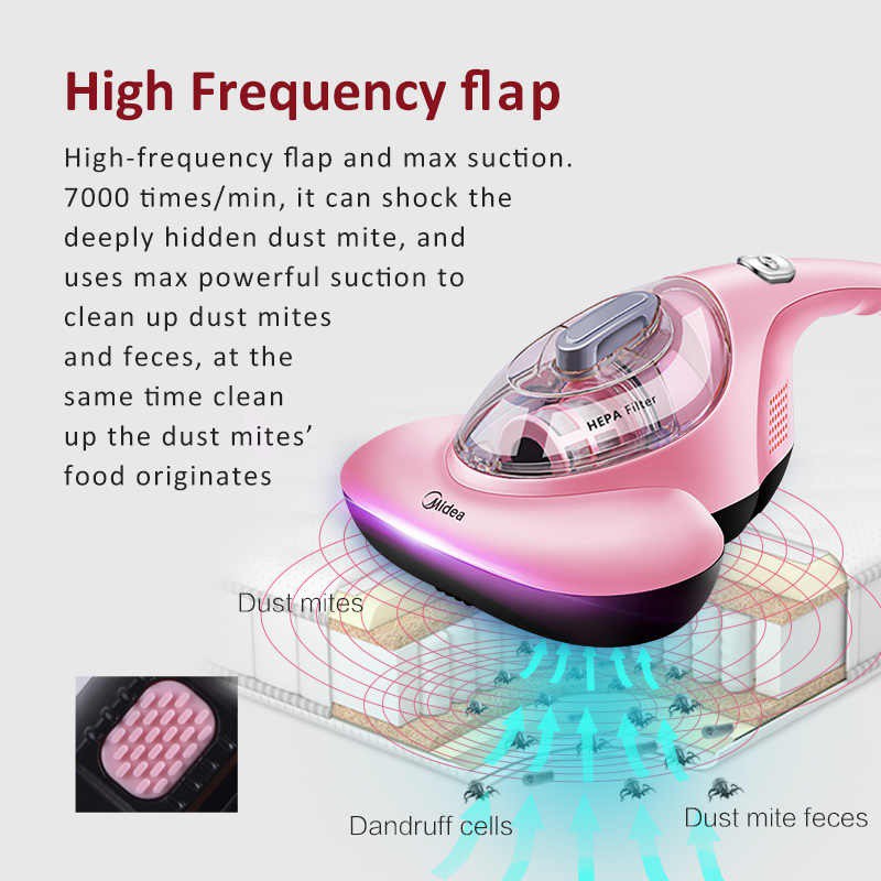 • High-frequency flap and max suction. 7000 times/min, it can shock the deeply hidden dust mite, and uses max powerful suction to cleanupdust mitesand feces, at the same time clean up the dust mites’ food originates