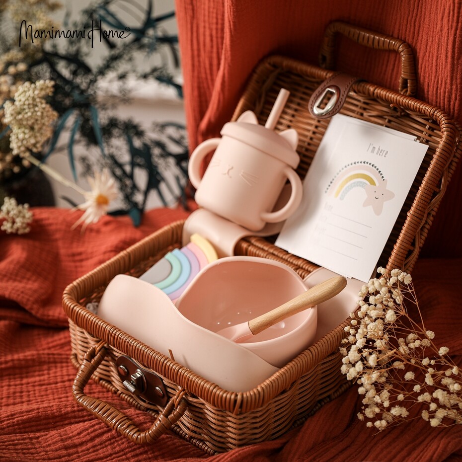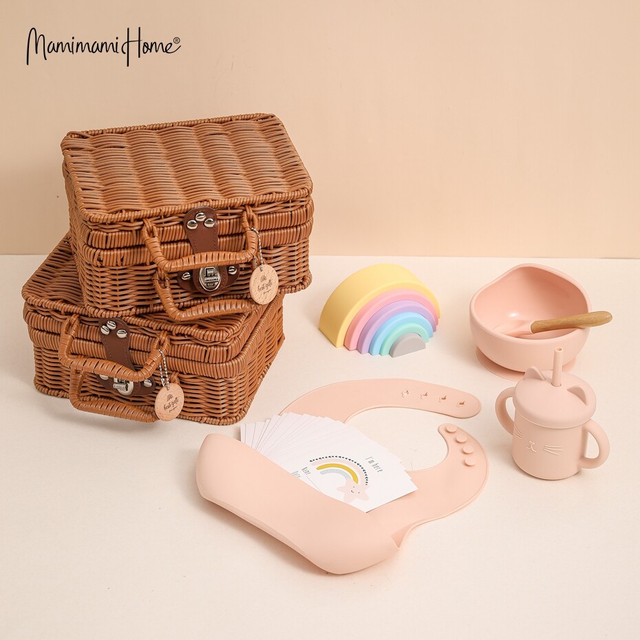 Mamimami Home Baby Meal Feeding Set 100% Silicone Bowl,Sippy Cup,Bib Natural Rattle Toy Toddler Gift with Rattan Box