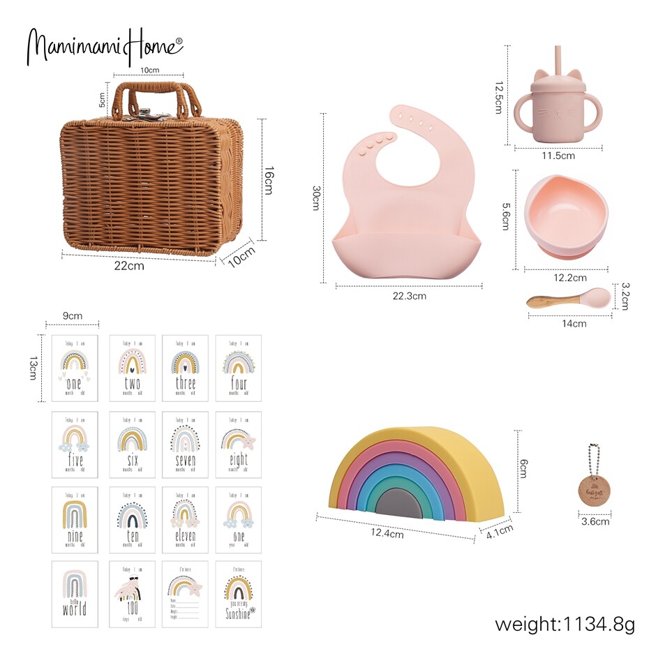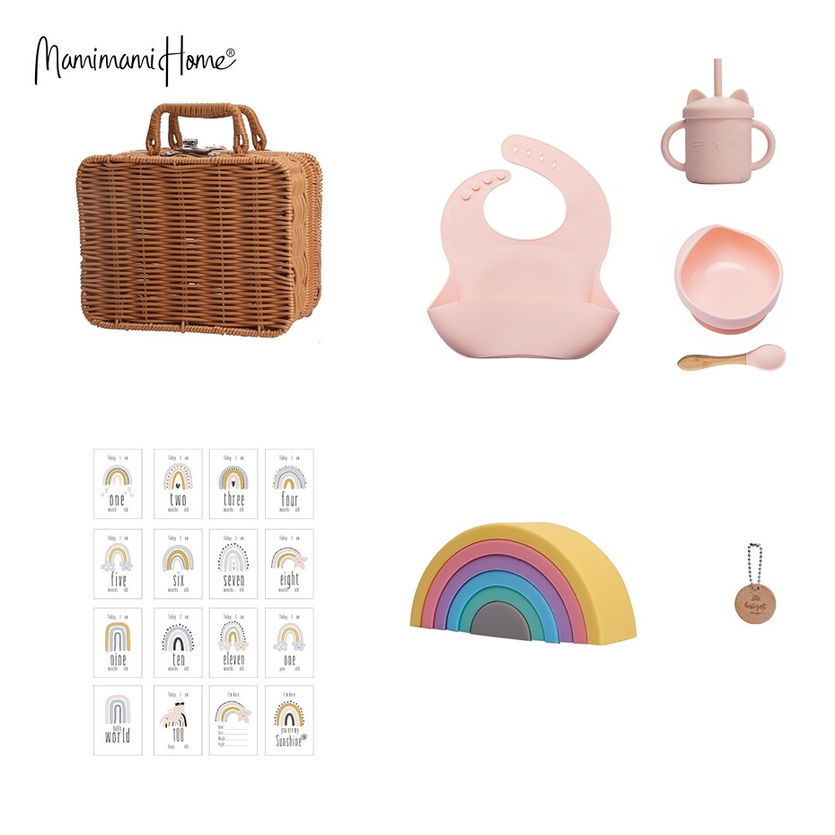1 x Silicone Bib,1 x Silicone Spoon,1 x Sippy Cup,1 x Silicone Bowl,1 x Silicone Building Block,1 x Rattan Box,16 x Milestone Cards