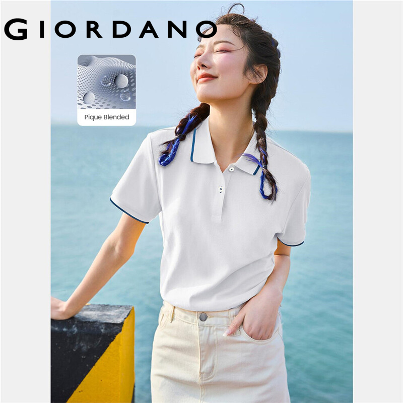 Giordano Women Polo Shirts Classic Collar Ribbed Cuffs Pique Polo Shirts Mesh Structure Short Sleeves Slim Polo Shirts 05311399