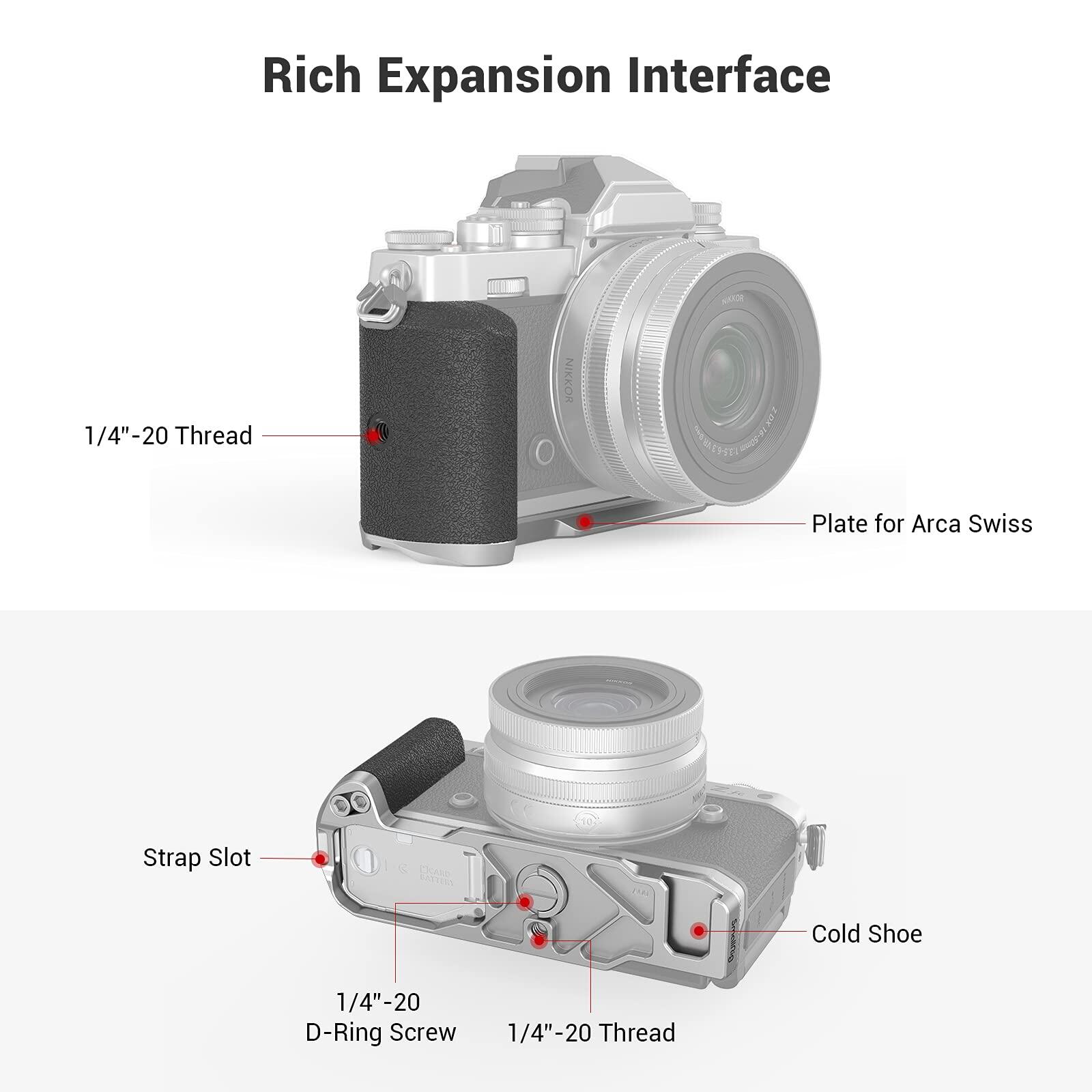 SmallRig L-Shape Grip for Nikon Z fc Camera 3480 is designed to provide a comfort grip. The retro-style grip shares similar texture and color with the camera; the baseplate shares the same silver surface treatment with the camera and fits perfectly. The L grip secures to the camera via a 1/4"-20 D-ring screw on the bottom and comes with a built-in 1/4"-20 threaded hole on the grip that enables vertical shooting on a tripod. The baseplate features a built-in Arca Swiss plate to quickly switch to tripod shooting, and a 1/4"-20 threaded hole at the center that supports tripod or Manfrotto quick release plate. In addition, the baseplate features a built-in cold shoe allows attaching microphone, light and other accessories; the plate also comes with a slot for wrist strap. The grip adopts compact and lightweight design, which is easy to carry around.