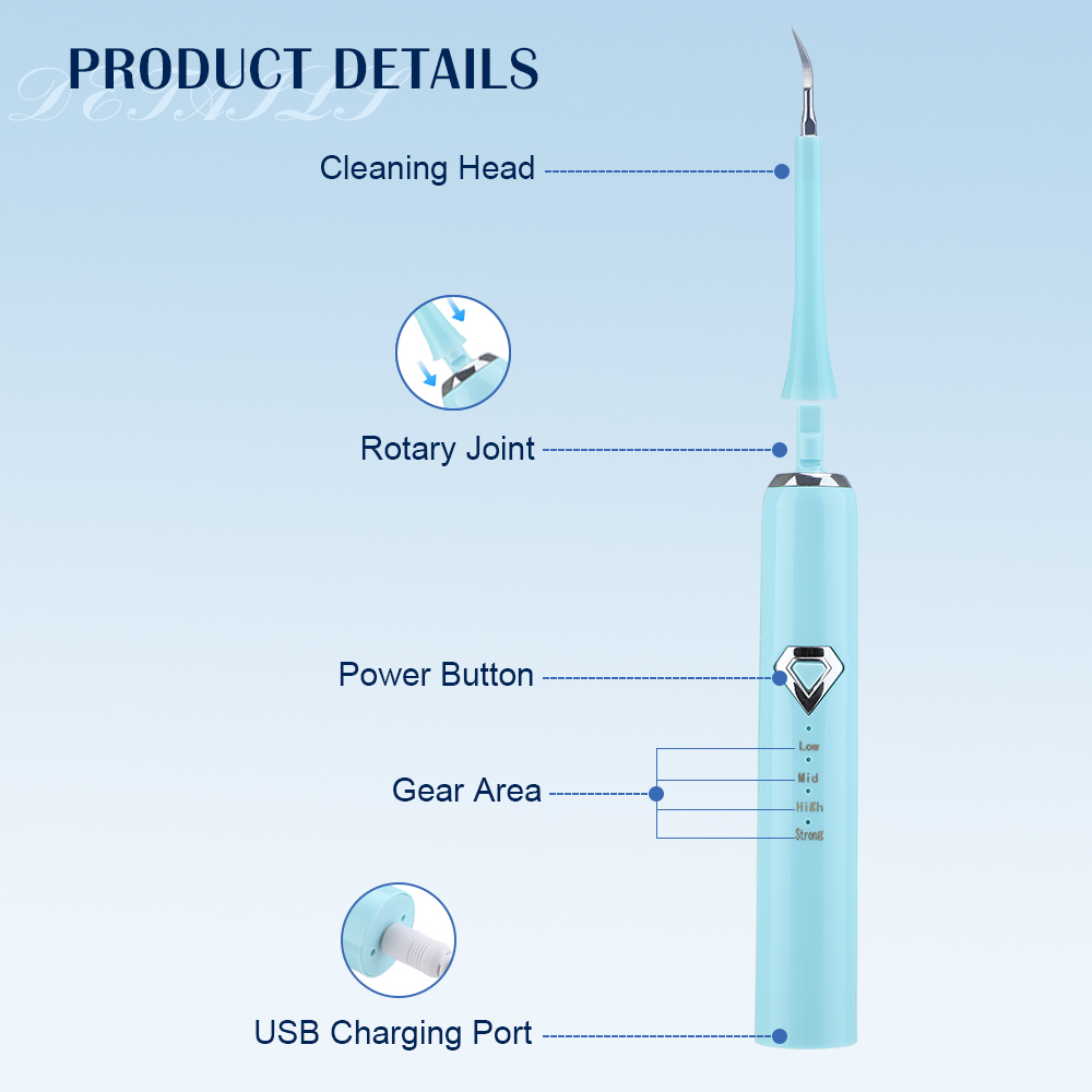 4.Equipped with a medical grade alloy steel head (flat head/pointed head), it professionally removes tartar, smoke stains, tea stains and plaque from the tooth surface and on the gums, leaving your teeth fresh and clean.