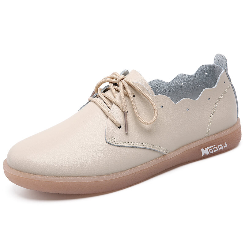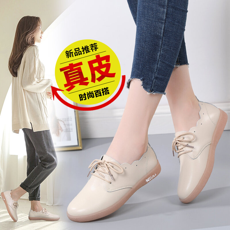 Genuine Leather Shallow Mouth Flower Flat Heel Casual Sneakers Women's Korean-Style Flat White Shoes Lace-up round Toe Non-Slip All-Match Women's Shoes
