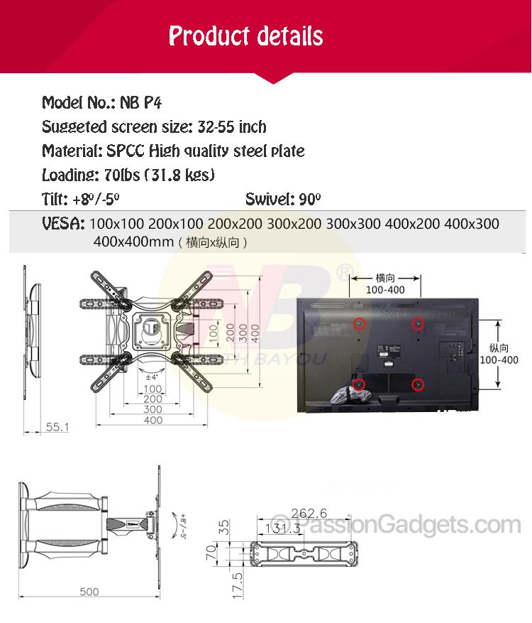 * With this full-motion mount, you can be easy to fix, tilt, extend, fold and rotate your TV and any viewing angle whatever you wanted.