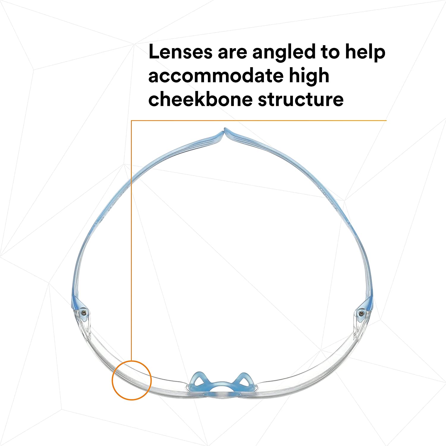Its adjusted lens angle and alternative nose bridge may help fit workers with tall cheekbone structure and low nose bridge height regardless of ethnicity.