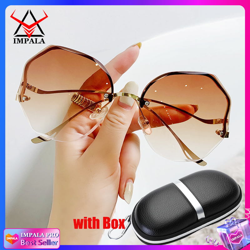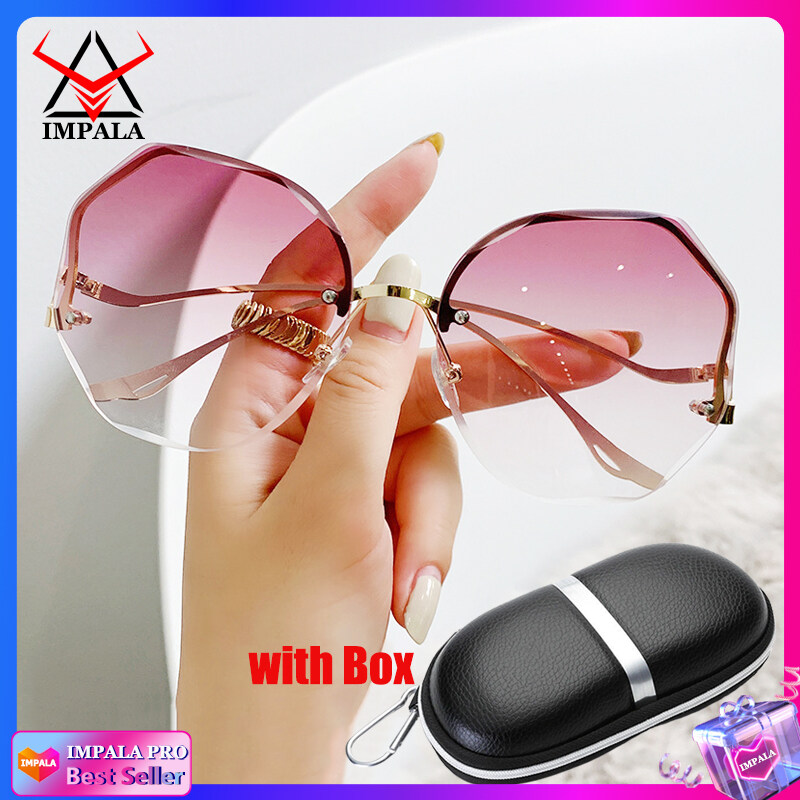 IMPALA QT3001L Fashion Rimless Sunglasses for Women Korea Style Sun Glasses for Female Sand Beach Eyewear UV Protective HD Lens Black Pink Blue Lens Optional with Box