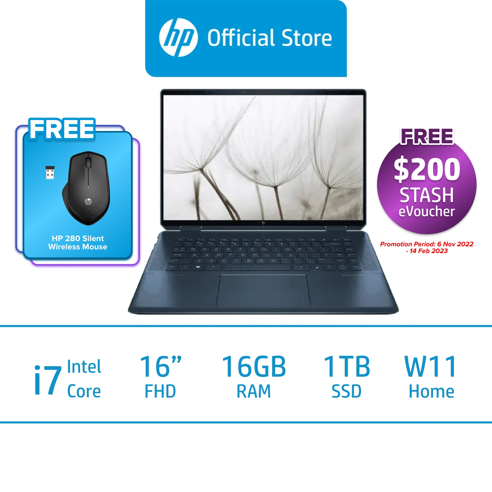 HP Spectre x360 2-in-1 Laptop 16-f0000TX / 11th Gen Intel i7-11390H / NVIDIA GeForce RTX 3050 / 16GB RAM / 1TB SSD / Windows 11 / 2 Years Onsite Warranty / 2 Years ADP
