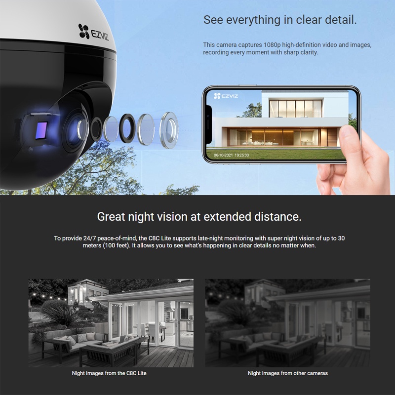 Welcome to EZVIZ Official Store~ We are 100% Singapore in stock, ship within 24 hours of your order! Specifications: ✅Model CS-C8C Lite (1080P) ✅Safty Mark No.:210084-15 ✅Camera -Image Sensor: 1/2.7" Progressive Scan CMOS -Shutter Speed: Self-adaptive shutter -Lens: 4mm @ F1.6, view angle: 87° (Horizontal), 105° (Diagonal) -PT Angle: Pan: 352°, Tilt: 95° -Minimum Illumination: 0.5 Lux @ (F1.6, AGC ON), 0 Lux with IR (data is obtained from EZVIZ laboratories) -Lens Mount: M12 -Day & Night: IR-cut filter with auto switching -DNR: 3D DNR -WDR: Digital WDR -Black & White Night Vision: 30 m / 100 ft. ✅Video & Audio -Max Resolution: 1920 × 1080 -Frame Rate: Max: 30fps; Self-Adaptive during network transmission -Video Compression: H.265 / H.264 -H.265 Type: Main Profile -Video Bit Rate: Ultra-HD; Hi-Def; Standard. Adaptive bit rate. -Audio Bit Rate: Self-Adaptive -Max. Bitrate: 2Mbps ✅Network -Wi-Fi Standard: IEEE802.11b, 802.11g, 802.11n -Frequency Range: 2.4 GHz ~ 2.4835 GHz -Channel Bandwidth: Supports 20MHz -Security: 64/128-bit WEP, WPA/WPA2, WPA-PSK/WPA2-PSK -Transmission Rate: 11b: 11Mbps,11g :54Mbps,11n :72Mbps -Wi-Fi Pairing: AP pairing -Protocol: EZVIZ Cloud Proprietary Protocol -Interface Protocol: EZVIZ Cloud Proprietary Protocol -Wired Network: RJ45 × 1(10M/100M Adaptive Ethernet Port) ✅Storage -Local Storage: Micro SD card slot (Max. 256G) -Cloud Storage: EZVIZ Cloud Storage ✅Function -Smart Alarm: AI-powered human shape detection -Customized Alert Area: Supports -Audio: Supports mic -General Function: Anti-flicker, dual-stream, heart beat, password protection, watermark ✅General -Operating Conditions: -30°C ~ 60°C(-22°F to 140°F ), humidity 95% or less (non-condensing) -IP Grade: Weatherproof Design -Power Supply: DC 12V / 1A -Power Consumption: MAX. 6 W -Dimensions: 158 × 157 × 149 mm (6.22 × 6.18 × 5.87 inch) -Packaging Dimensions: 197 × 185 × 205 mm (7.76 × 7.28 × 8.07 inch) -Net Weight: 510 g (17.99 oz) -Weight (With Package): 885 g (31.22 oz) ✅In the box -Camera (×1) -Power Adapter (×1) -Screw Kit (×1) -Waterproof Kit (×1) -Drill Template (×1) -Regulatory Information (×1) -Quick Start Guide (×1) ✅Certifications -Certifications UL / FCC / CE / WEEE / REACH / ROHS