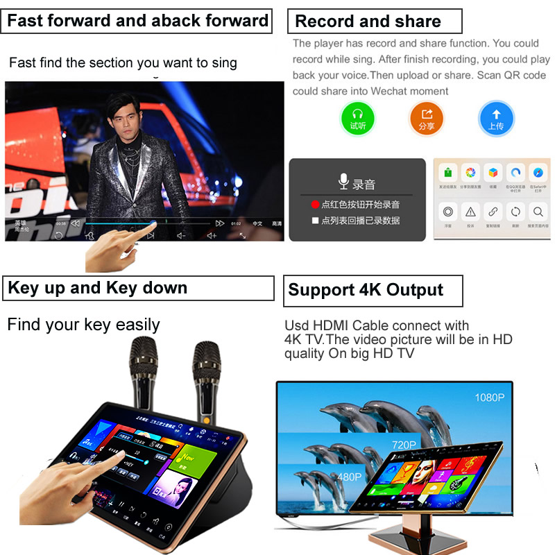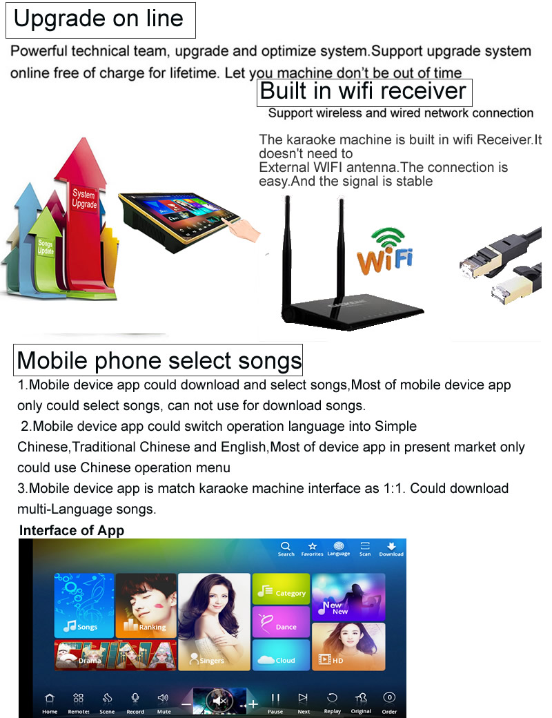 5.Songs quantity: Chinese English songs preloaded for directly karaoke singing.More than 10 countries songs on cloud for free download