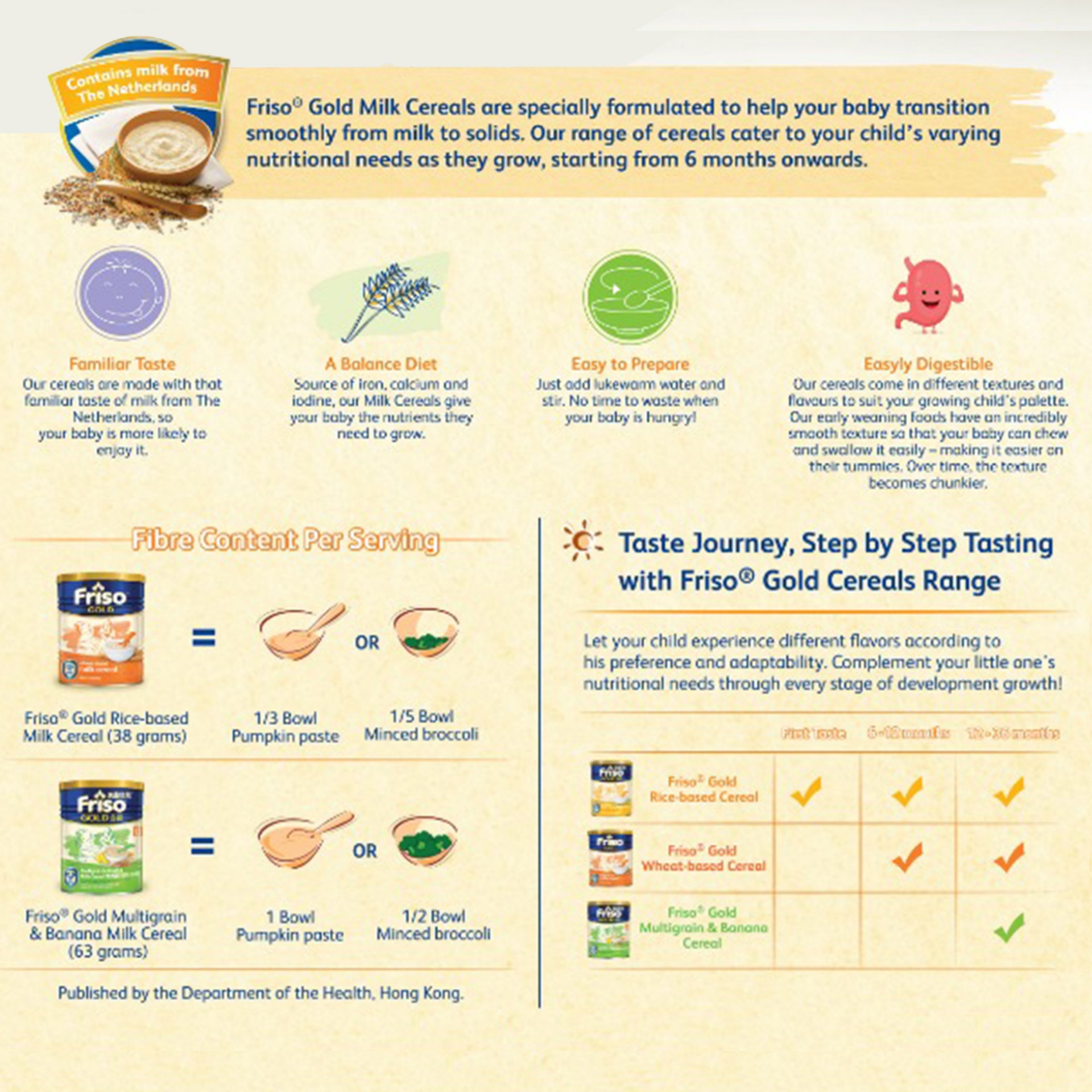 As you wean your baby, they are likely to eat less until they become more familiar with solid food. Friso Gold Multigrain & Banana milk cereal are rich in important nutrients to ensure you baby has a balanced diet. They are also made with milk powder so they taste more familiar to your baby. the smooth texture eases their first step into eating solids and is for the little tummies.